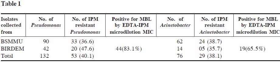 A total of 132 Pseudomonas and 76 Acinetobacter were studied of which 90 Pseudomonas were isolated from BSMMU (53 non ICU and 37 ICU) and 42 were from BIRDEM (13 non ICU and 29 ICU). Out of 76 Acineobacter 62 (36 non ICU and 26 ICU) from BSMMU and 14 were from BIRDEM (6 non ICU and 8 ICU). Amongst them, 53 (40.1%) Pseudomonas and 29 (38.1%) Acinetobacter isolates were resistant to IPM. These IPM resistant isolates were tested for MBL production by IPM-EDTA microdilution MIC method.