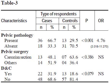 Table-3: Distribution of pelvic conditions between cases and controls