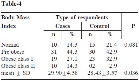 Table-4: Distribution of body mass index between cases and controls
