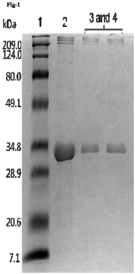 Recombinant LipL32 protein was over expressed from the recombinant plasmid pAELipL32 which we obtained from Prof. OA Dellagostin, Núcleo de Biotecnologia, Centro de Desenvolvimento Tecnológico, Universidade Federal de Pelotas, Brazil. The recombinant plasmid was transformed into BL21(DE3) plysS strain. For protein purification, positive clone was inoculated into 100 ml Luria Broth (LB) and allowed to grow at 370C until the OD reached to 0.5 to 0.6 at 600 nm, induced with 1.0 mM IPTG (isopropyl-b-D-thiogalactopyranoside) for about 4 hour. Cell pellet was resuspended in BugBuster Protein Extraction Reagent and purified using His•Bind Purification Kit (Novagen, USA). The purified antigen (Fig-1) was reconstituted with sterile distilled water to make a concentration of 1 µg/µl and aliquoted for further use. The expression and purification of protein was carried out at Advanced Medical & Dental Institute, Universiti Sains Malaysia, Malaysia.