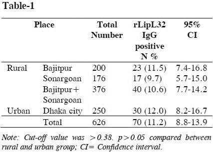A total of 626 samples were included in the study. Out of which, 376 samples were healthy individuals from rural area and 250 were febrile cases from urban area. Out of total 626 study population, anti-rLipL32 specific IgG antibody higher than the cut-off OD value (>0.38) were detected in 70 individuals (11.2%). The rate of positivity of anti-rLipL32 antibody among the healthy individuals from rural area (Bajitpur and Sonargaon) was 10.6%, while the rate was 12.0% in urban population. The detail location wise (urban and rural) rate of seropositivity is shown in Table 1. The rate of positivity in rural and urban population was not significantly (p>0.05) different.