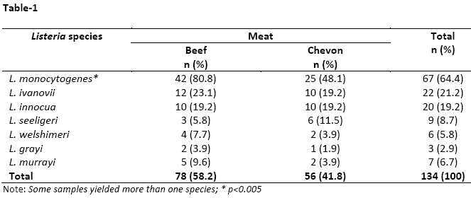 Table-1: Types of Listeria species isolated from beef (n=52) and chevon samples (n=52)