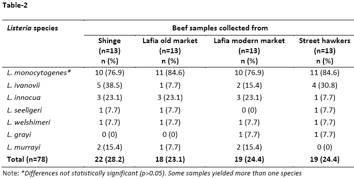 Table-2: Distribution of Listeria species in raw beef samples collected from different locations