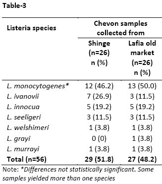 Table-3: Distribution of Listeria species in raw chevon samples collected from Shinge and Lafia old market