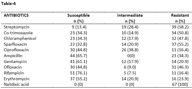 Table-4: Susceptibility pattern of L. monocytogenes to selected antimicrobial agents (N=67)