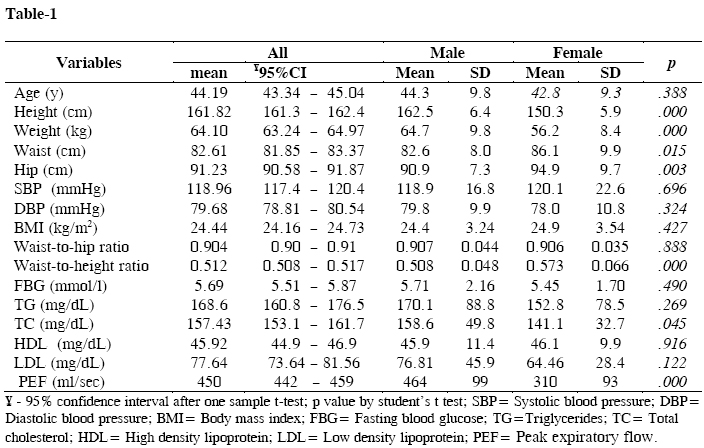 are expressed in means with 95% confidence interval (Table-1). The means with 95% CI of age, BMI, WHR, SBP and DBP were 44.19 (43.34 – 45.04) years, 24.44 (24.16 – 24.73), 0.90 (0.90 – 0.91), 118.9 (117.4 – 120.4), 79.69 (78.81 – 8/0.54), respectively. The comparisons of bio-physical characteristics (mean with SDs) between men and women were also shown in the same Table. Some anthropometric measures differed significantly. The peak flow value was found significantly higher in men than women.