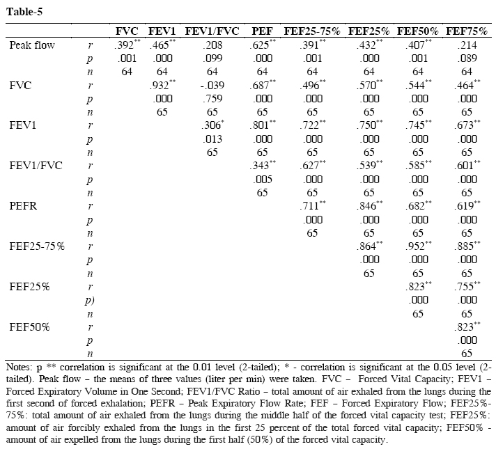 Table-5: Correlations between peak flow (liter/second) with values of spirometry