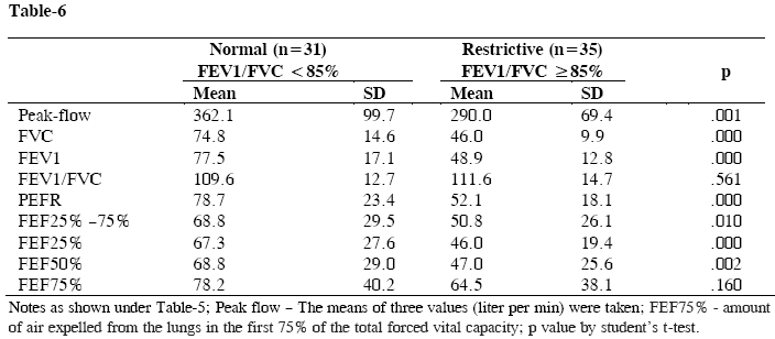 Most of the spirometry values correlated significantly with the values of peak flow indicating the importance of peak flow meter test. The spirometry values were used to detect restrictive and obstructive respiratory abnormalities. Table-6 compared the values between normal and restrictive lung function and Table-7 showed the comparisons between normal and obstructive ones. Both the tables showed significant differences of spirometry values between normal and restrictive; and between normal and obstructive lung functions.