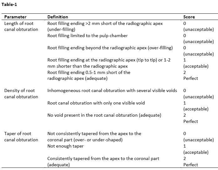 Table-1: Parameters used to evaluate the root canal obturation