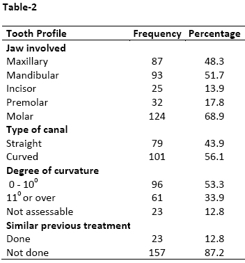 Table-2: Distribution of the radiographic cases by tooth profile (n = 180)