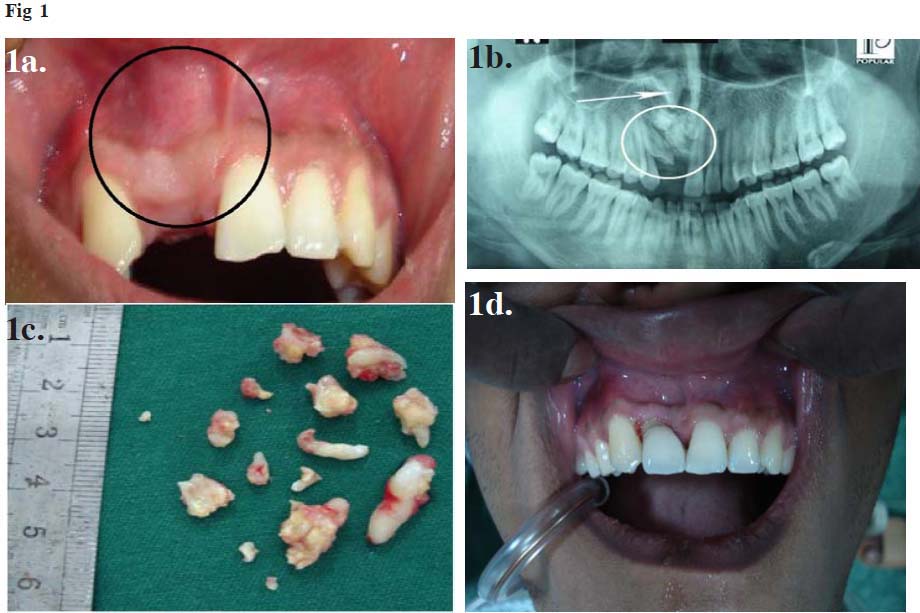A 21-year-old- man reported to the Department of Dentistry, BIRDEM Hospital, Bangladesh, with the complaint of missing upper right central and lateral incisors and hard swelling on apical region of that missing alveolus. He had normal shedding of upper deciduos central and lateral incisors teeth at the age of 6-8 years and since then no permanent dentition of upper right central and lateral incisors occured. The patient was healthy and well developed with an unremarkable medical history. He had no history of trauma to oro-facial region or dental extraction. There was no family history of unerupted teeth or hypodontia. Extra oral examination revealed no abnormality in the upper lips as well as in the right side of the maxilla. Intra oral examination revealed a well defined gingival hard swelling which was palpated in the apical area of unerupted incisors (Figure -1a). No inflammatory change was noticed on the overlying and marginal gingiva and interdental papilla. The space for the eruption of the maxillary right central incisors was naturally maintained in the dental arch but the space for lateral incisor was reduced due to medial drifting of maxillary right canine. No midline deviation was diagnosed in comparison to the dental arch and the facial midline. There was no regional lymphadenopathy. An intra oral periapical and panoromic radiograph revealed impacted lateral incisor with multiple radio-opaque structures around the crown of the unerupted incisors region obstructing the eruption of the tooth (Figure -1b). The mass was surrounded by a narrow radiolucent zone. On the basis of clinical examination and radiological evaluation, the case was diagnosed as a compound odontome with impacted lateral incisor. Surgical removal of the odontome, extraction of impacted lateral incisor and its re-implantation was planned.